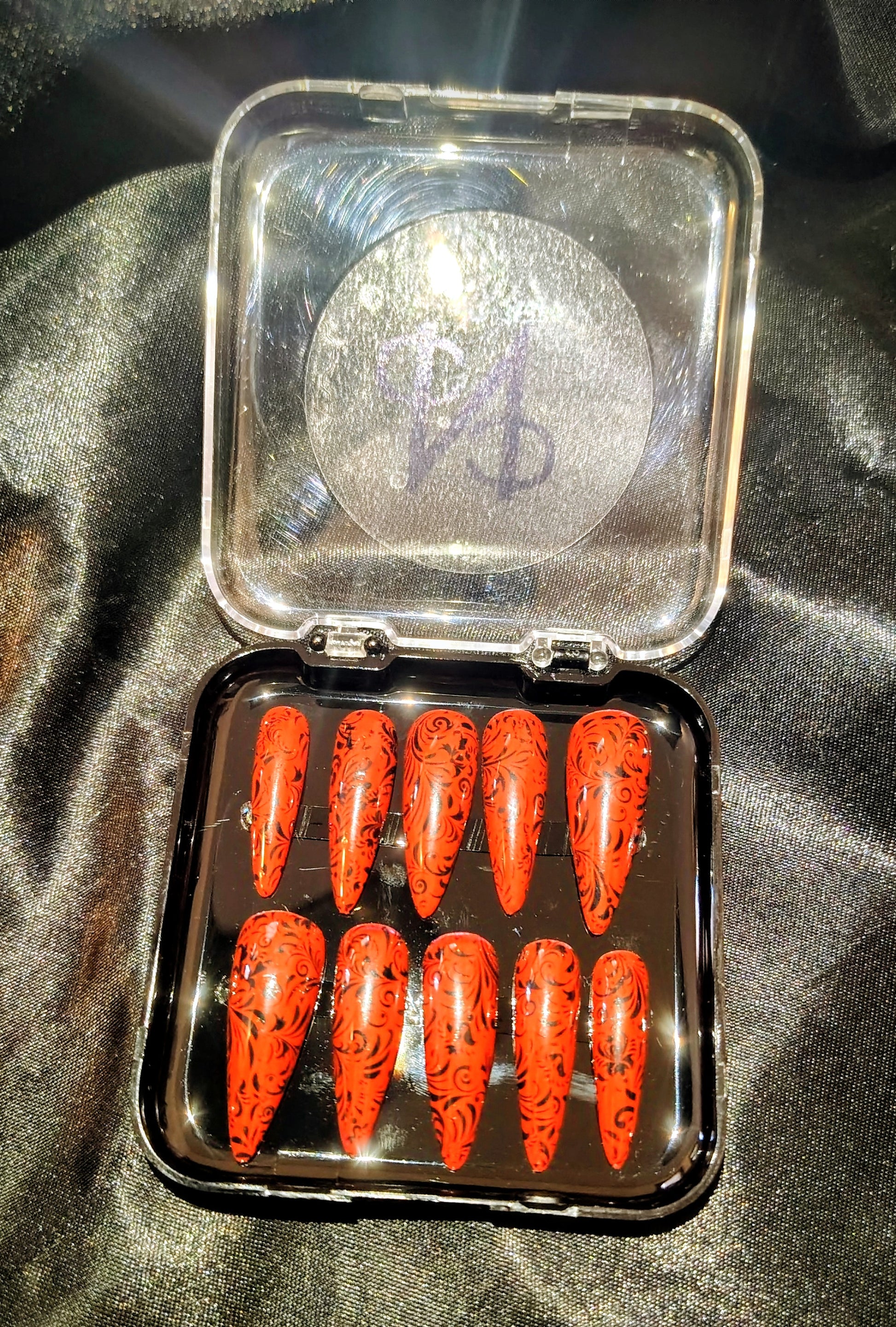 Step into your villain era with the Crimson Lace press-on set by Click Clack Nails™️ — a bold, seductive fusion of fiery red and intricate black scrollwork detailing.